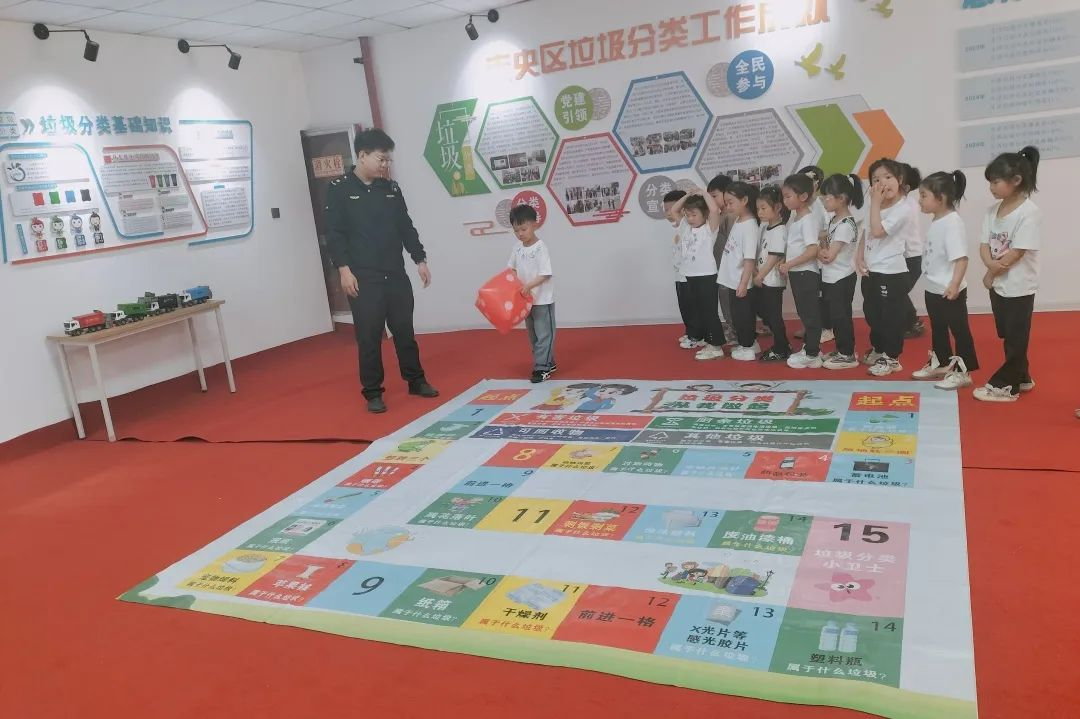 “红色大嘴吃危险,绿色肚子装剩饭!”伴随着朗朗上口的童谣,孩子们冲进游戏体验区。在“分类投投乐”环节,萌娃们手持垃圾卡片,踮起脚尖将“废旧电池”投入红色有害垃圾桶,又蹦跳着把“苹果核”塞进绿色厨余桶。一旁的垃圾分类飞行棋游戏区同样热火朝天,小朋友奋力抛出骰子,盯着地上的巨型棋盘大喊:“我跳到‘过期药片’啦!要放进红色格子!”孩子们边跳格子边抢答,笑声与提示声此起彼伏。
