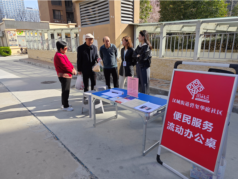 “流动服务办公桌”进小区、入家门、了民情、听民意。社区服务情系千家万户,为了推进治理服务落实到最后一米,充分掌握社情民意。2月以来,汉城街道碧玺华庭社区定期在管辖的4个小区摆放流动办公桌,社工、楼栋长和志愿者错时服务,入户走访征询意见、建议和微心愿24条,及时掌握居民需求7个,预防初期纠纷和潜在矛盾4起,交办业委会督促物业整治安全隐患9起,做到早发现早预防早干预早处置,提高为民服务和民主议事协商的精准化和高效化。