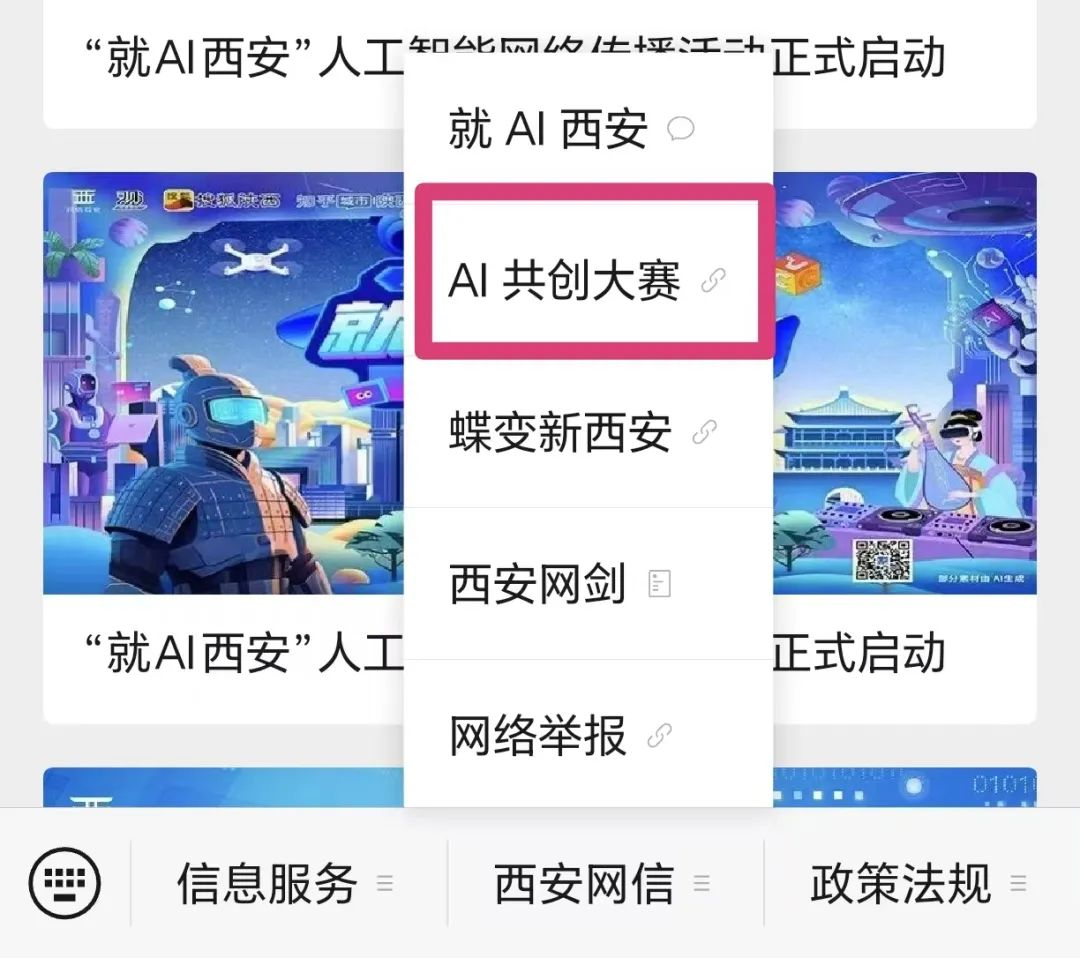 1、微信入口:关注“网观西安”或“网信西安”,在公众号下拉栏找到“就AI西安”专栏点击进入或在公众号对话框输入“就AI西安”关键词即可获取报名链接。
