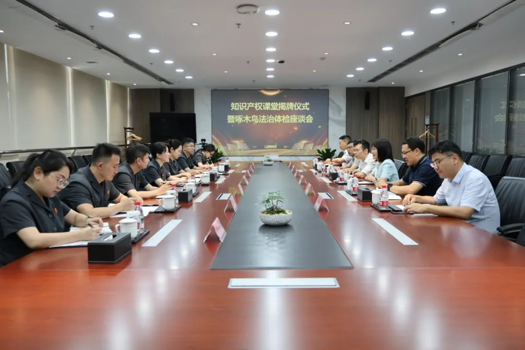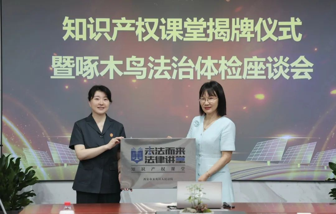 未央法院党组书记、院长李宝玲,隆基绿能公司董事、副总裁刘学文共同为“‘未’法而来·法律讲堂”之“知识产权课堂”揭牌。