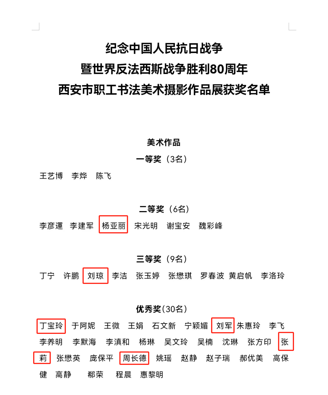 笔墨书写峥嵘岁月,镜头定格时代风采。近日,在市总工会举办的“纪念中国人民抗日战争暨世界反法西斯战争胜利80周年西安市职工书法美术摄影作品展”活动中,未央区17件职工作品喜获佳绩!