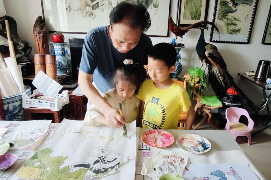 今年盛夏,一场特殊的“爷孙画展”在社区广场启幕。120张国画作品将长廊装点得墨香四溢,既有杨和平深耕半世纪的山水花鸟精品,更有20余幅孩子们的稚嫩习作。其中,孩子们的作品被特意置于最显眼的位置,8岁李卓樾的卡通工笔国画,用灵动线条勾勒出童趣;7岁杨舒茗的扇面小猫,或憨态可掬、或凝神远眺;张语知笔下的花鸟,落笔虽显稚嫩,却已初具韵味。