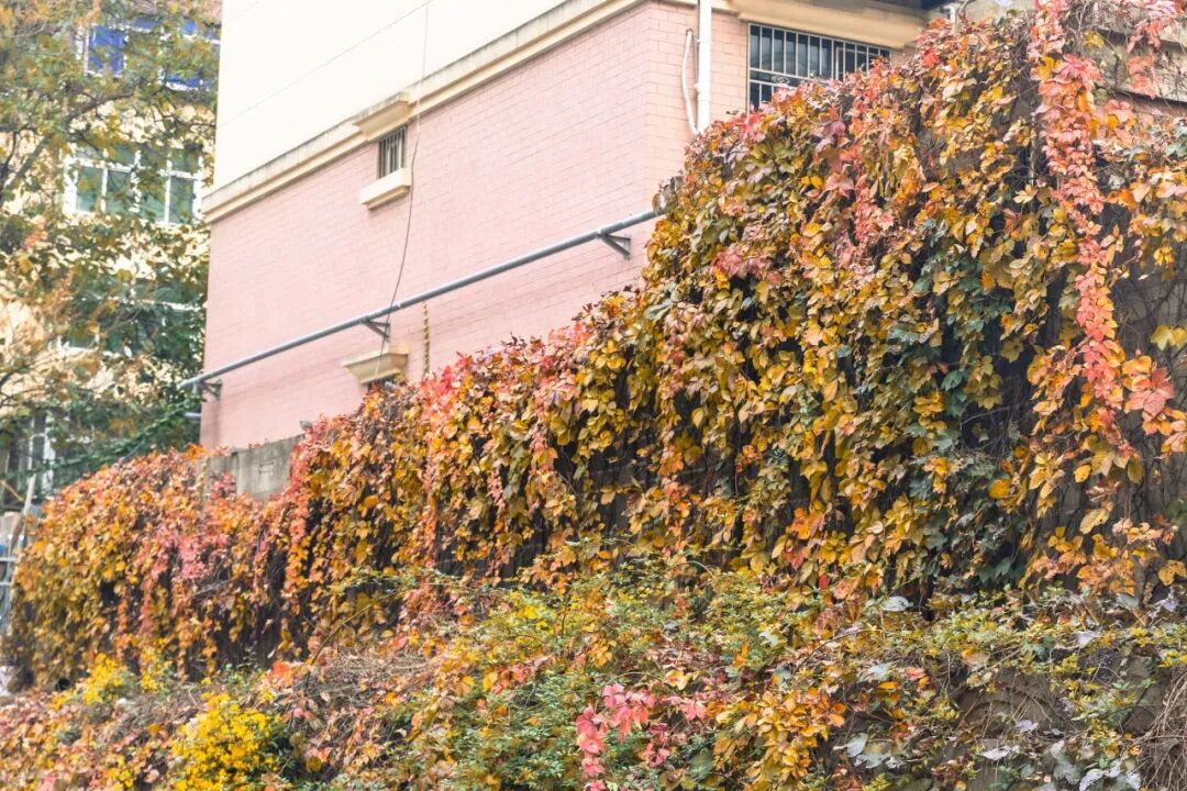 这是一面被岁月青睐的墙。茂密的藤蔓从夏日葱茏走到了秋末的斑斓,红叶与黄叶交织,像一幅天然的油画。几片落叶悄然挂在墙头,风起时便轻轻摇曳。站在这里,仿佛能听到时光流淌的细微声响,静谧而充满力量。