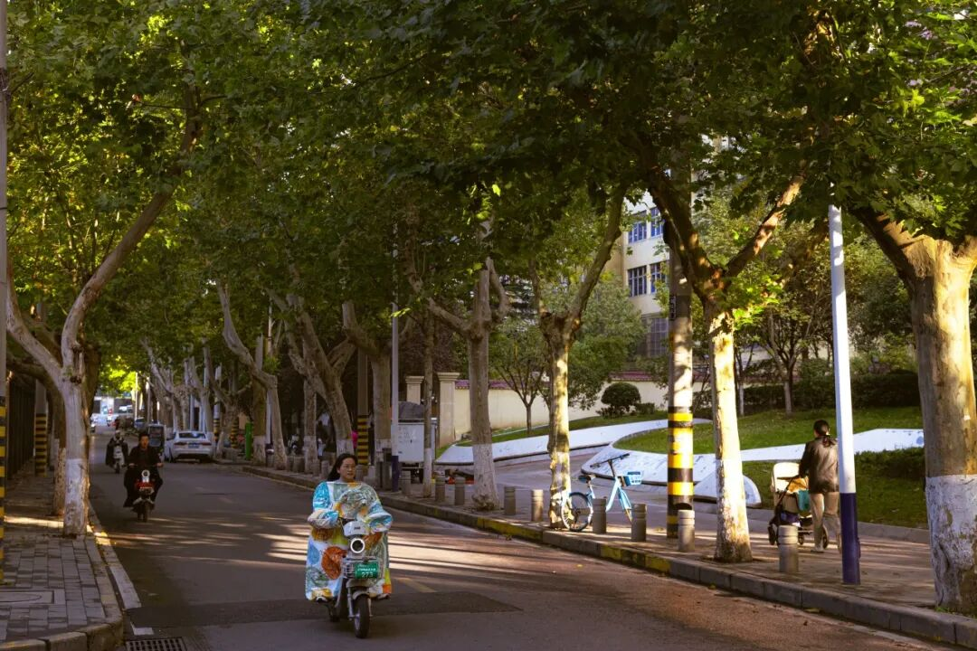傍晚时分,下班的人们骑着电动车穿梭在归家的途中。路旁的树木被西斜的日光拉出长长的影子,与车影、人影交织在一起,构成一幅流动的光影画卷。这匆忙又温馨的一刻,是无数未央人一天中最放松的过渡。