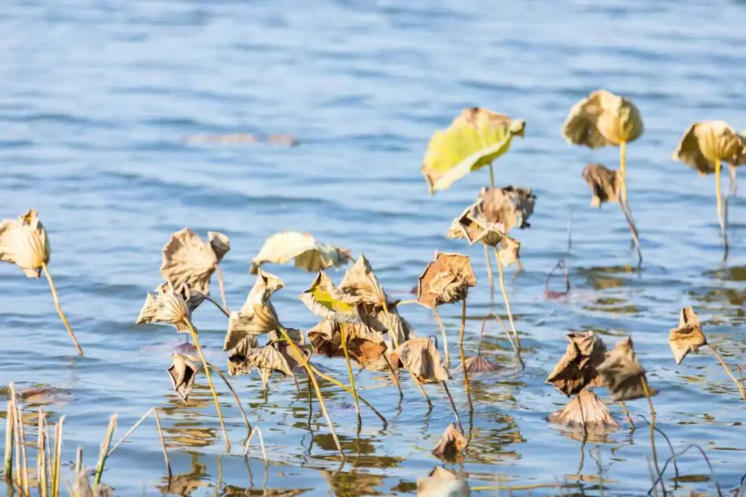 相较于枝头的热闹,水面则显得更为沉静诗意。未央湖的碧波,在此刻成了一面天然的画布。飘落的枯叶,如一只只倦游归来的小船,静静地泊在水面。有的三三两两,聚散依依;有的独自漂泊,安然自得。天空的倒影、残荷的枝干与这些斑驳的叶,共同构成了一幅流动的、极具禅意的水墨画。