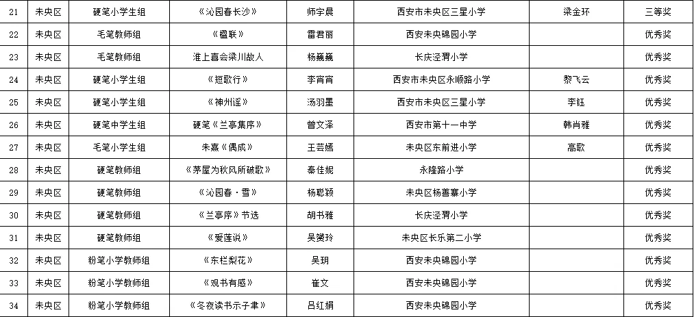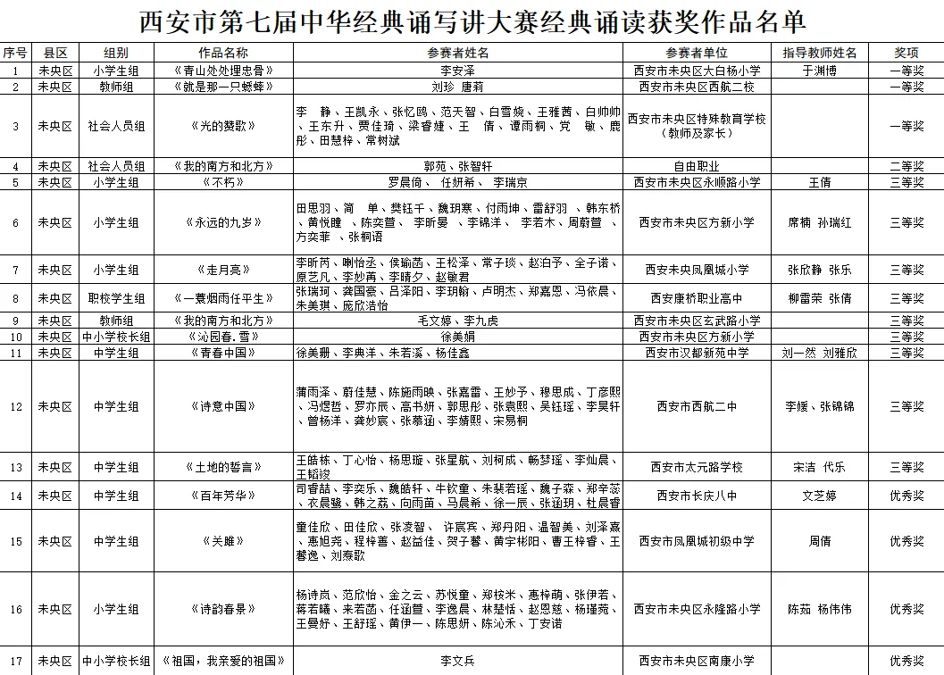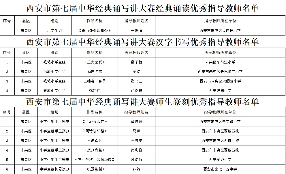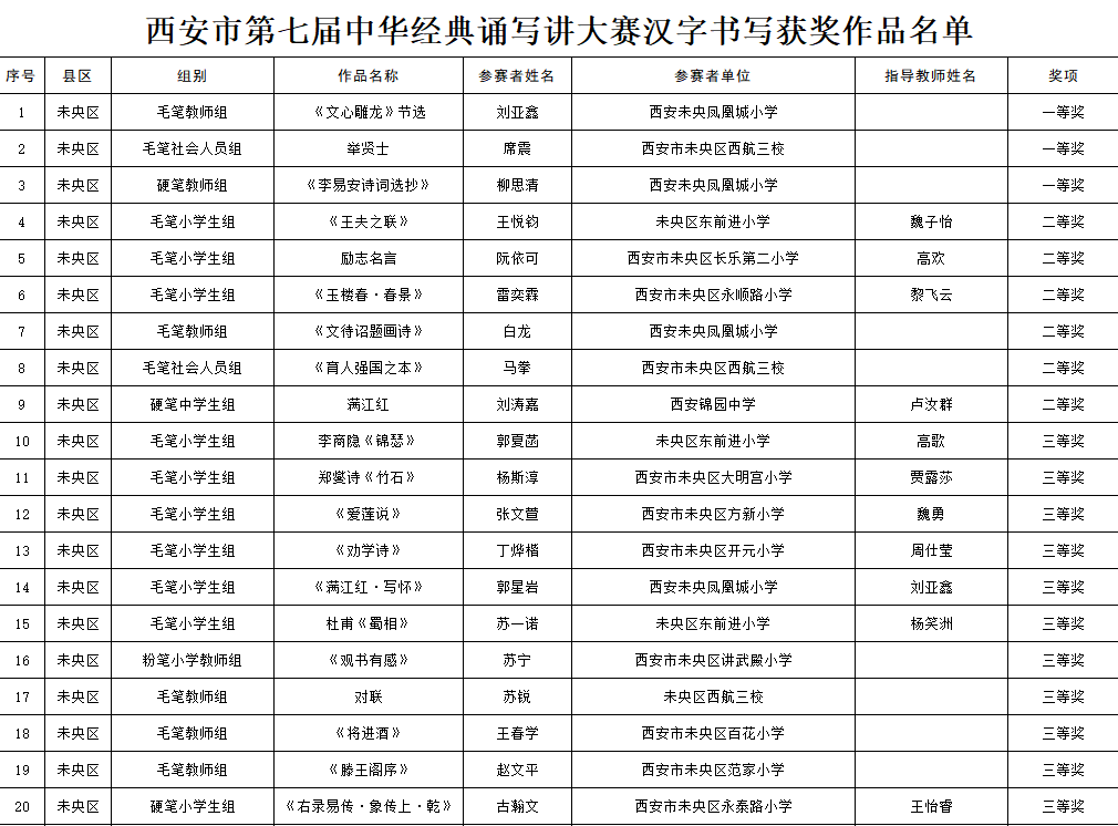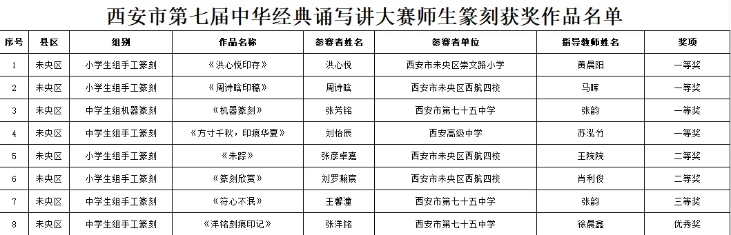 由西安市教育局办公室公布的西安市第七届中华经典诵写讲大赛评选结果的通知中获悉,未央区教育局选送的“诵读中国”经典诵读作品荣获三个一等奖、一个二等奖、九个三等奖、四个优秀奖;“笔墨中国”汉字书写作品荣获三个一等奖、六个二等奖、十二个三等奖、十三个优秀奖;“印记中国”师生篆刻作品荣获四个一等奖、两个二等奖、一个三等奖、一个优秀奖;三项赛事中共有十一位老师荣获优秀指导教师奖。