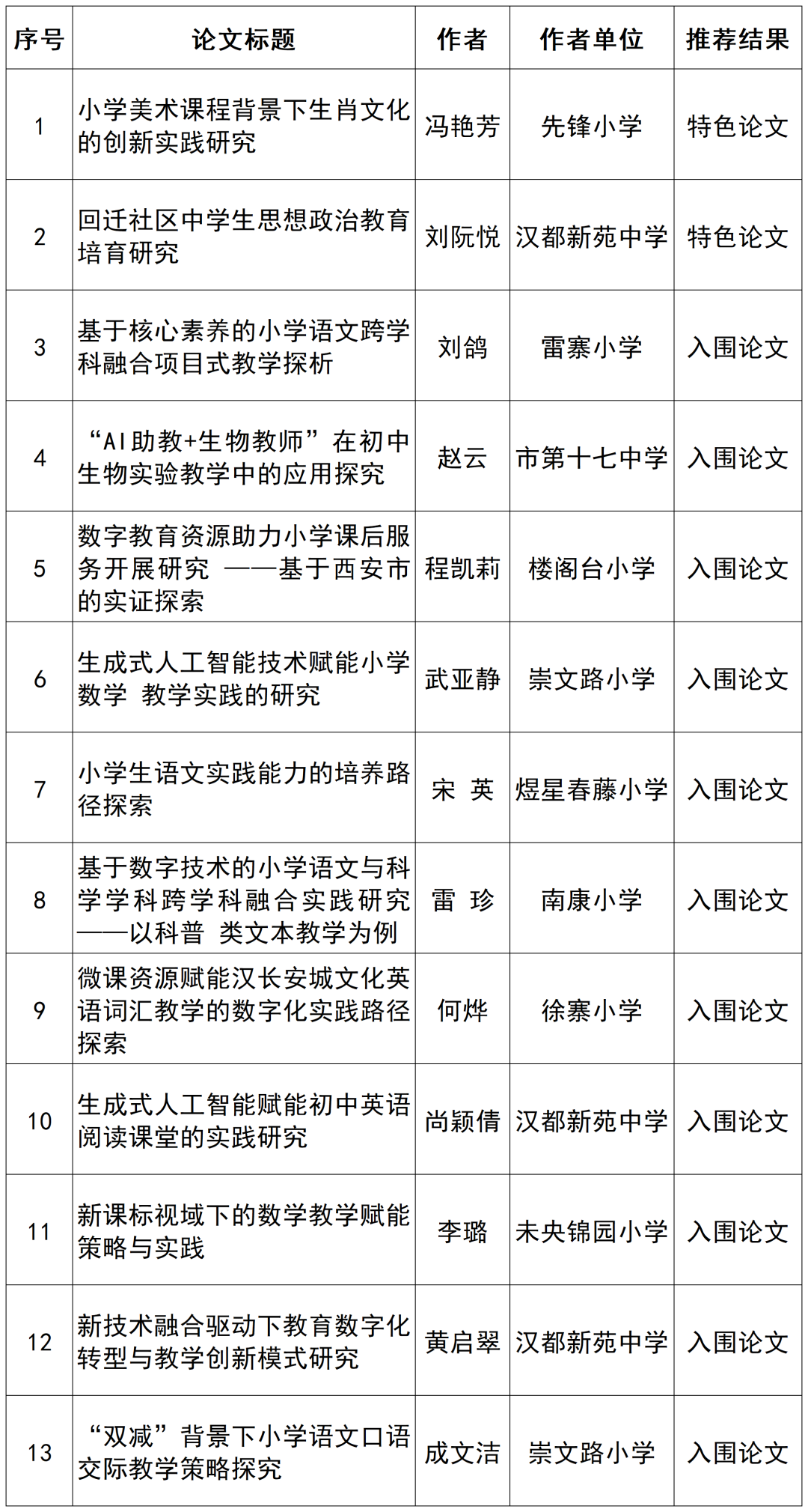 未央区教师凭借扎实的教研功底与创新的教育实践,喜获亮眼成绩,共13篇论文入选推荐名单,包括特色论文2篇,入围论文11篇。未央区获奖论文篇数较去年增加9篇,全市排名前三。