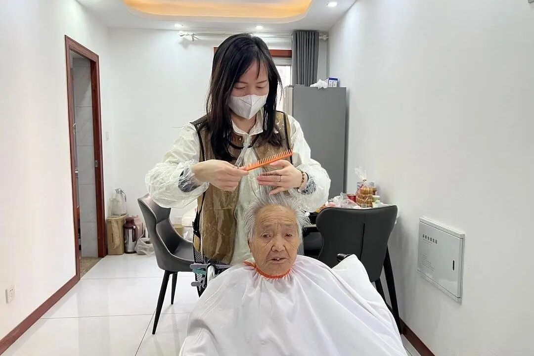 “奶奶,您想是留短一点还是稍微修一修?”近日,在未央区草滩街道草一社区96岁的晁桂珍老人家中,爱心理发师轻声询问老人意愿,为老人开始理发。