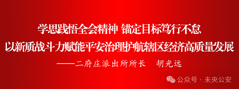 雄关漫道真如铁,而今迈步从头越。二府庄派出所将以党的二十届四中全会精神为根本遵循,把“两个维护”注入警魂,锚定“统筹发展和安全”总要求,始终保持时时放心不下的责任感、事事落实到位的执行力,从严锻造铁军队伍,在防风险、保安全、护稳定、促发展的实战中勇毅前行,以高水平安全保障高质量发展,为谱写中国式现代化建设新篇章交出优异答卷。