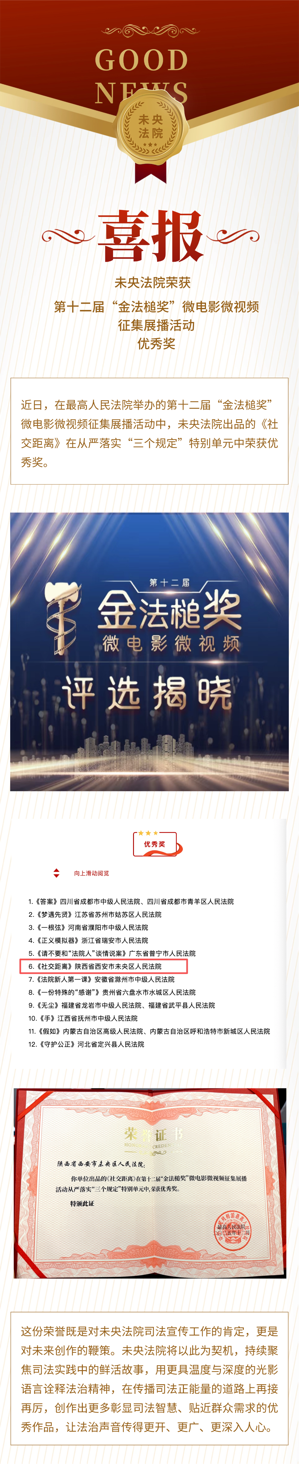 喜报 | 未央法院微视频《社交距离》荣获“金法槌奖”优秀奖