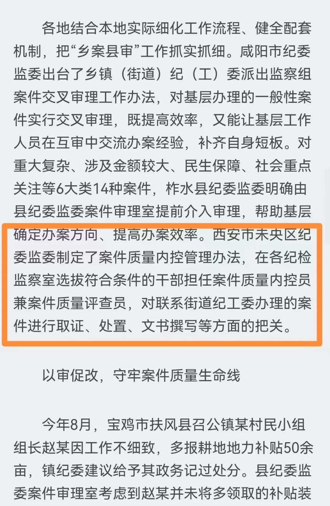 12月23日,《中国纪检监察报》第6版“求实”栏目刊发稿件《陕西持续深化“乡案县审”系统提升基层案件查办质量》,文中提及未央区制定案件质量内控管理办法,提升基层案件查办业务水平。