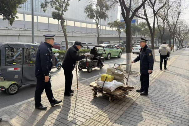 这份主动向前的担当,在面对需要帮助的老人时,体现得尤为细致。2月2日,辛家庙中队的队员在巡查中,发现一对老夫妇推着废品车颤巍巍地走在车流不息的机动车道。队员们立即上前,一边耐心讲解危险性,一边合力将沉重的推车稳稳护送到人行道上,再三叮嘱后才放心离开。