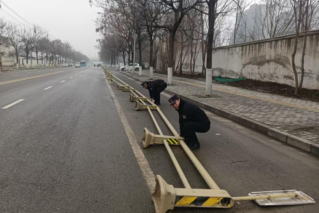 1月31日,谭家中队两名队员,面对一段长约15米的护栏突然侧翻,他们没有等待指令,没有呼叫支援,而是徒手协作,耗时近半小时,将沉重护栏一节节扶正,用汗水换回了道路畅通。