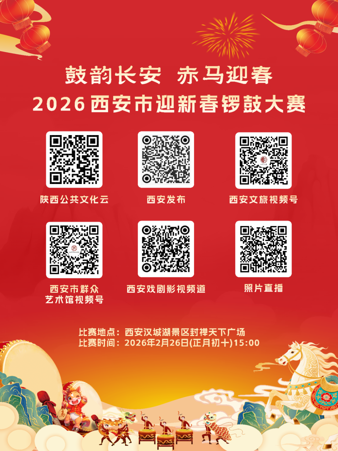 当千年鼓韵交融新春气象,一场传统与现代交融的文化盛宴即将盛大上演!2月26日,由西安市文化和旅游局、未央区人民政府、汉长安城特区管委会主办,西安市群众艺术馆、未央区文化和旅游体育局、汉城湖实业有限公司承办的“鼓韵长安赤马迎春”2026西安市迎新春锣鼓大赛将在西安市汉城湖封禅天下广场火热启幕!