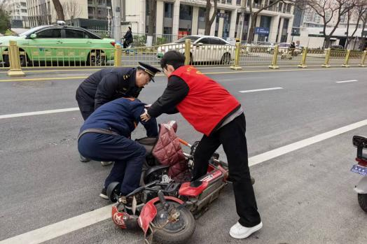 无独有偶。3月2日,徐家湾中队执法队员张家幸、李顺在渭滨路邮局周边开展日常巡查时,也遇到了一起交通事故,一名骑电动车的群众不慎摔倒。