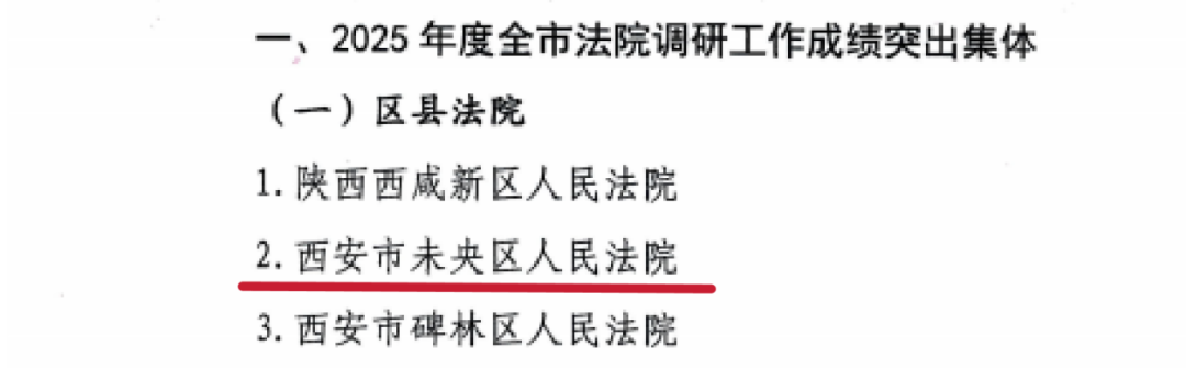 西安市未央区人民法院获评2025年度全市法院调研工作成绩突出集体,五名干警荣获2025年度全市法院调研工作成绩突出个人。