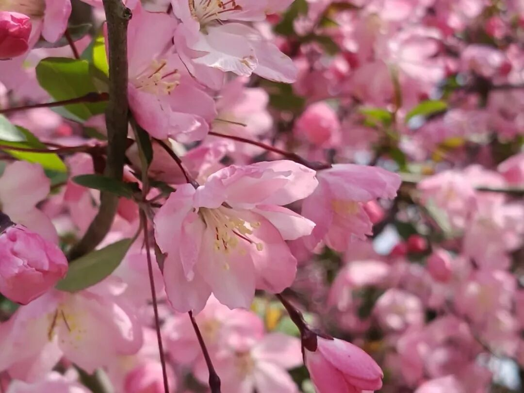 在未央,如果要给“Color Walk”定一个主题色,粉色一定是当仁不让的主角。走进大明宫,不必急于寻找成片的花海。低头看看路旁,那一树树看似低调的紫叶李,其实正在悄悄绽放。它的花朵极小,粉中透白,像是用极细的毛笔在宣纸上点出的工笔画。当微风吹过,花瓣如雪片般飘落,落在肩头,也落在宫墙的倒影里。这种不争不抢的粉色,是春天写给大地的情书,字迹虽小,却句句深情。